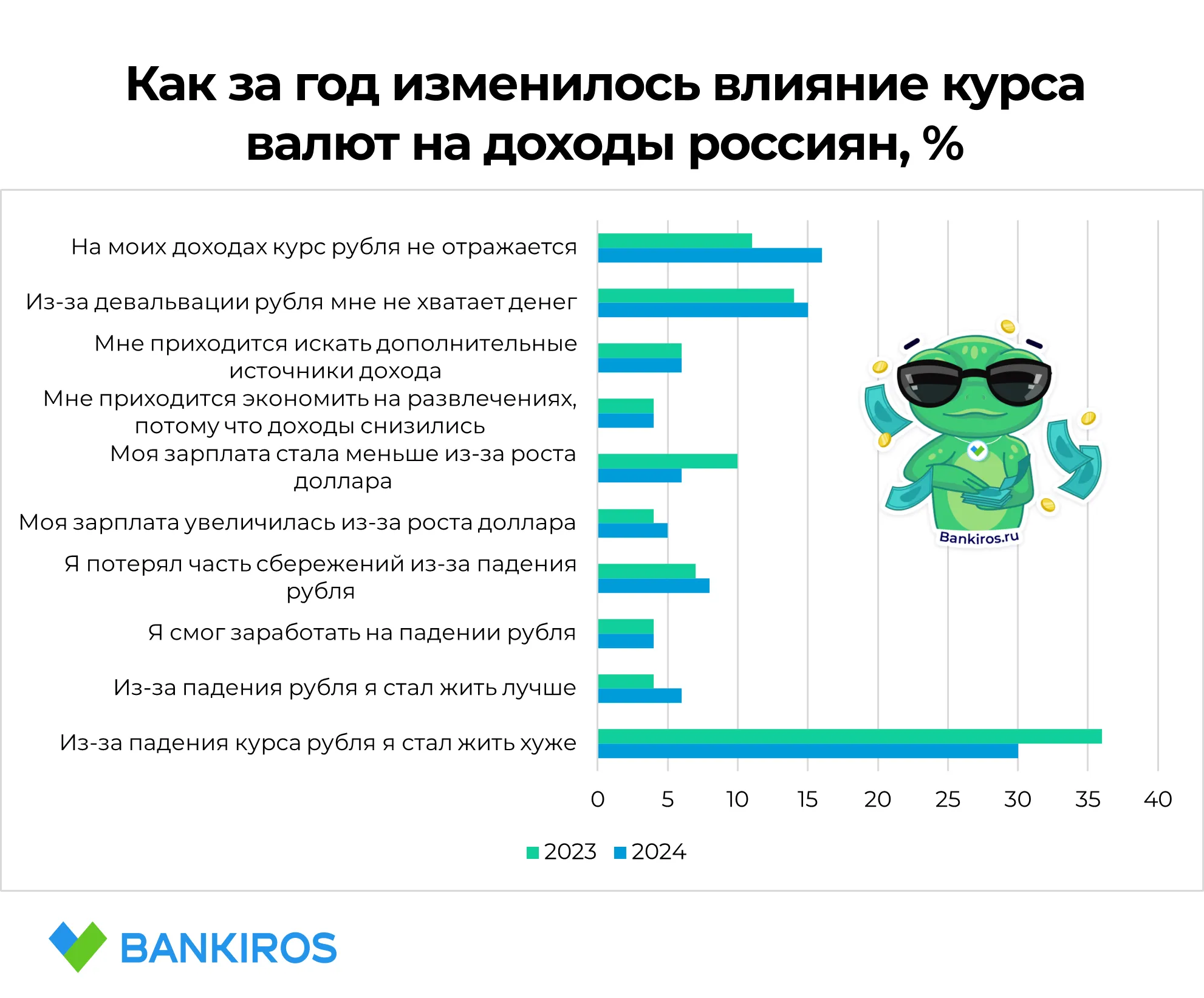 Стоит отметить, что доля граждан, которые почувствовали на себе негативные последствия от ослабления рубля, за рассматриваемый период стала меньше на 8%.