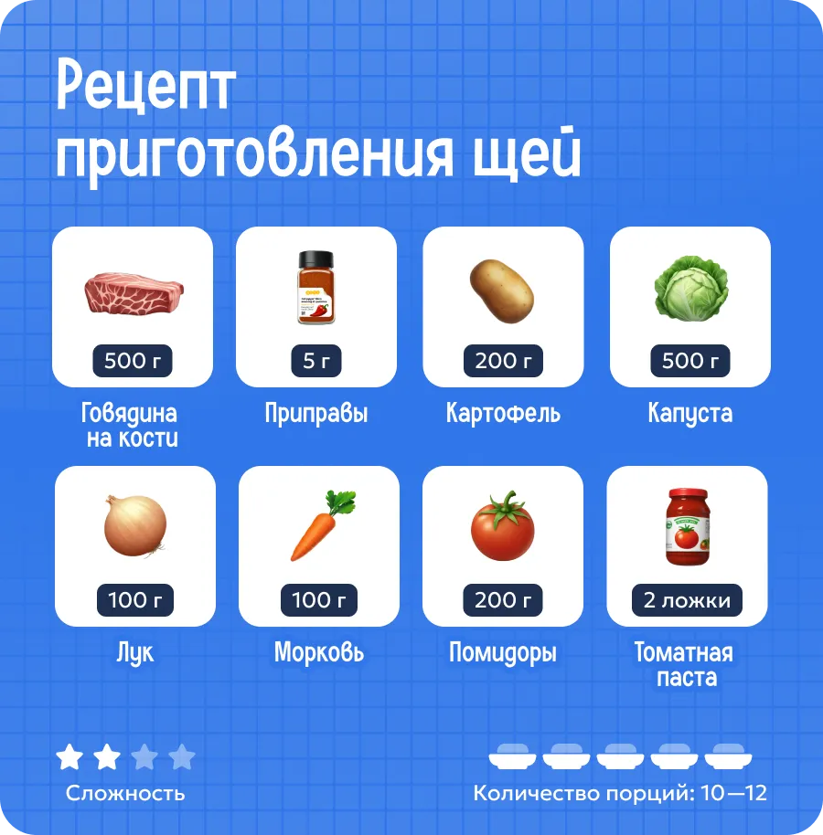 Согласно книге, на 500 граммов говядины, нужно брать три литра воды, таким образом, получится примерно пятилитровая кастрюля супа или 10-12 порций. В России продукты для супа из капусты будут стоить 434 рубля, исходя из цен в декабре 2024 года. Дороже всего обойдется мясо – 337 рублей за полкило.