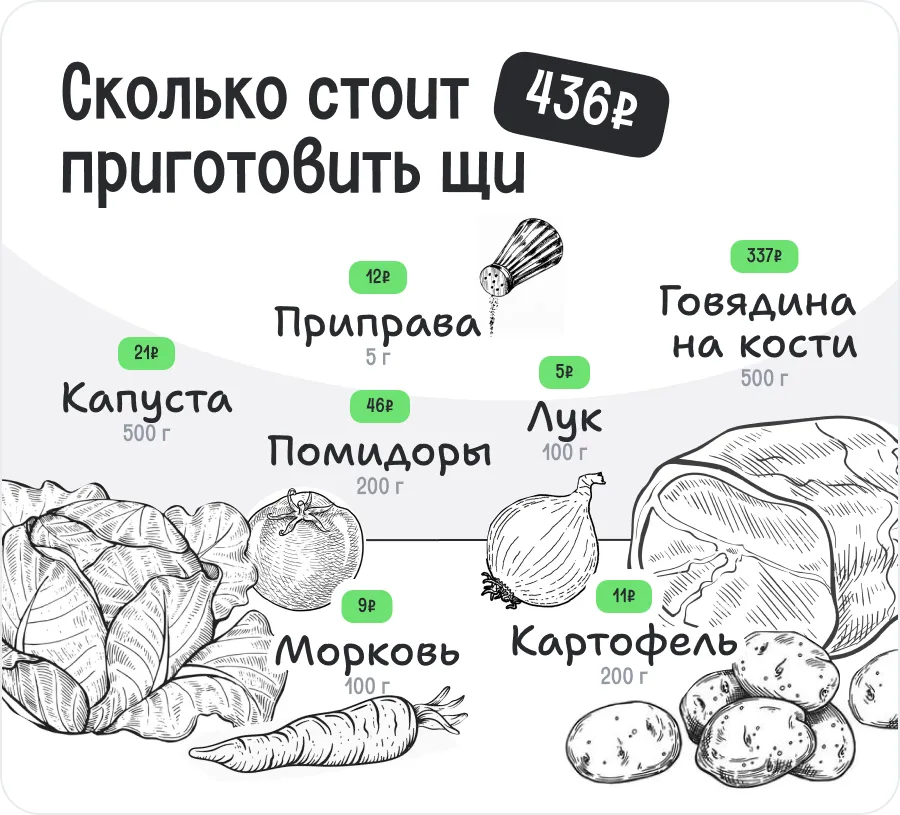- В России приготовление пятилитровой кастрюли щей стоит 436 рублей, что приравнивается к 10-12 порциям супа;
