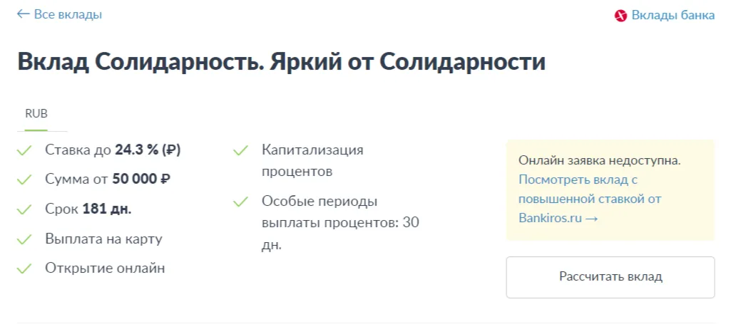 Выберем «Вклад Солидарность. Яркий от Солидарности» по ставке 24,3% сроком на 181 день на сумму от 50 тысяч рублей.
