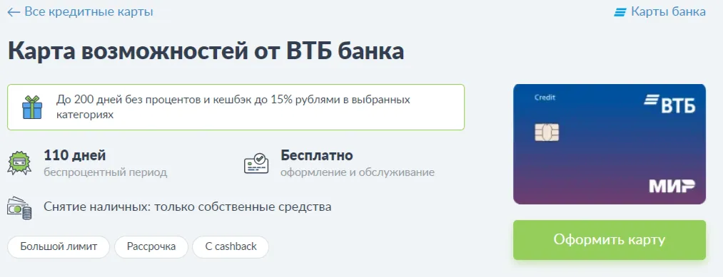 Для расчета возьмем «Карту возможностей от ВТБ банка», которая стала лидером нерекламного рейтинга Bankiros.ru среди других кредитных карт в январе 2025 года. Беспроцентный период по ней составляет 200 дней, обслуживание – бесплатное. Взять можно до млн рублей.