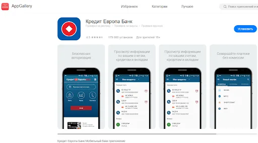 Для скачивания приложения Кредит Европа Банк на андроид необходимо перейти в Google Play или AppGallery. Последний каталог актуален для смартфонов Huawei и Honor. В каталоге достаточно нажать кнопку «Установить».