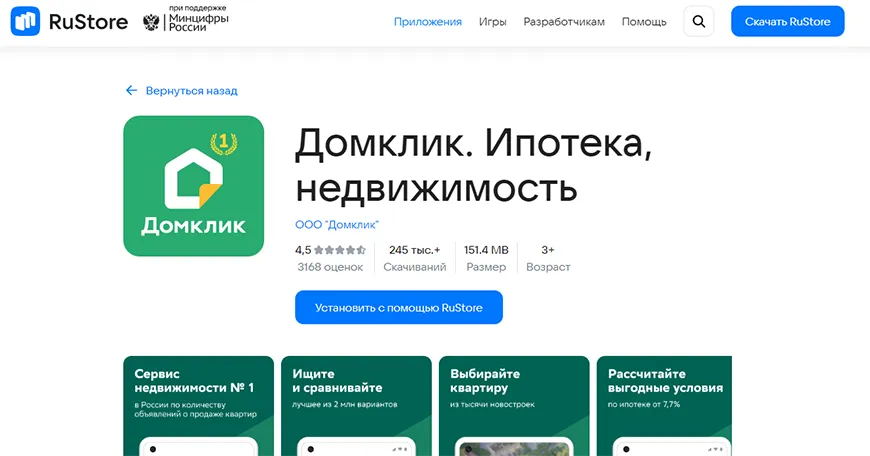 7. На любых смартфонах откройте RuStore, нажмите «Установить» для продукта «Домклик. Ипотека, недвижимость»;