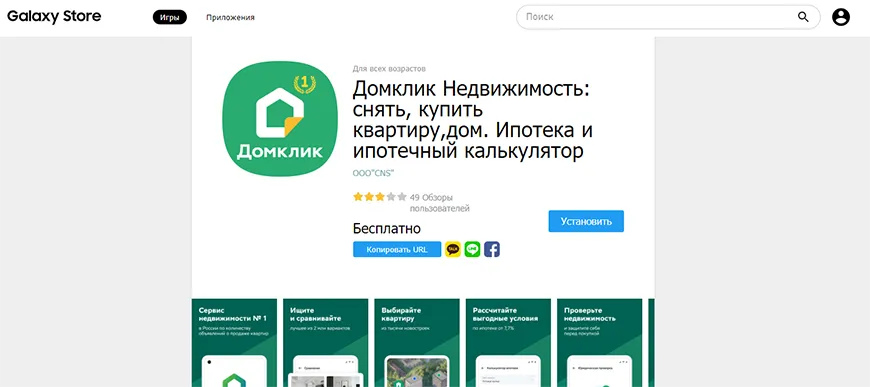 5. Для установки на Samsung выберите Galaxy Store, в карточке «Домклик Недвижимость: снять, купить квартиру, дом. Ипотека и ипотечный калькулятор» кликните «Установить»;