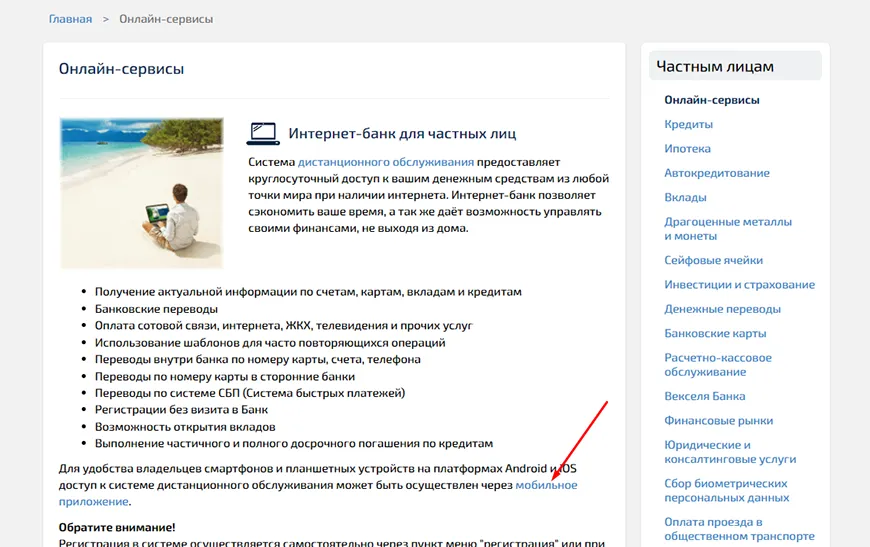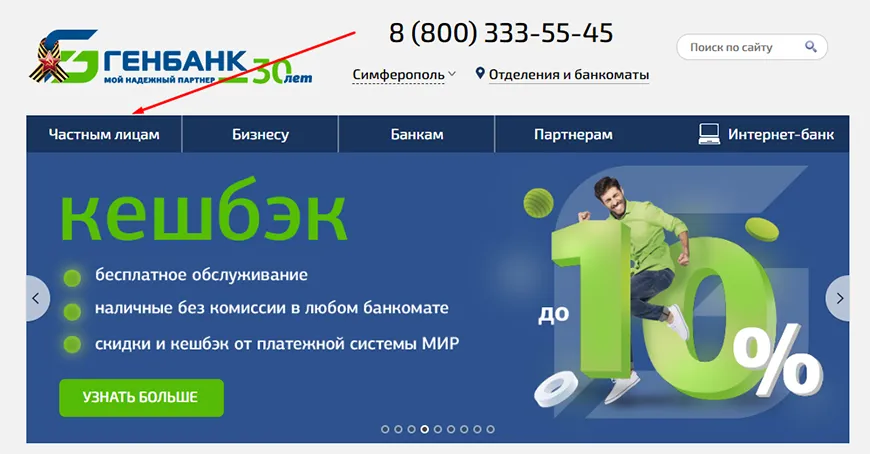 1. Зайдите на официальный сайт Генбанка и во вкладке «Частным лицам» нажмите «Онлайн-сервисы»;