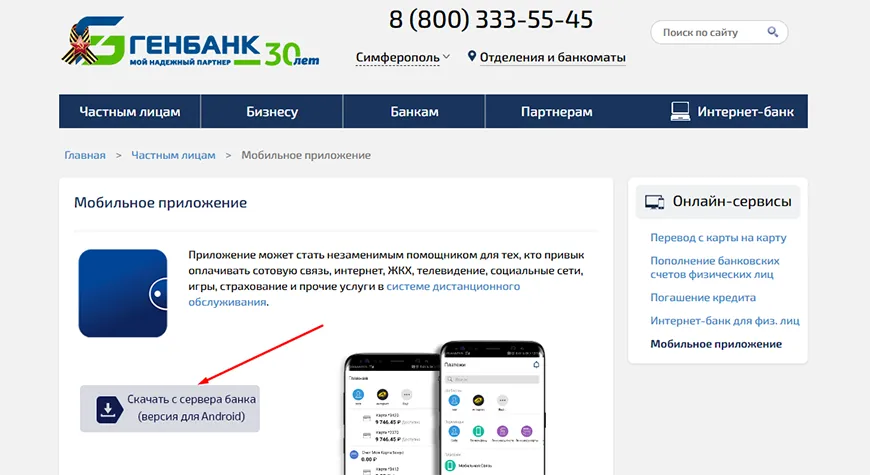 Генбанк – одно из ключевых финансовых учреждений, работающих в Крыму. Западные санкции в отношении компании были введены еще в 2014 году, но ограничения не помешали работе банка и не создали неудобств для клиентов. Скачать приложение Генбанк на андроид и айфон можно в Google Play, App Store и напрямую с сайта, также работает веб-версия личного кабинета.