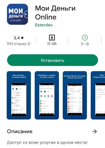4. Для упрощенной установки откройте Google Play, в поиске наберите «Мои деньги Online», откройте карточку продукта и нажмите «Установить»;