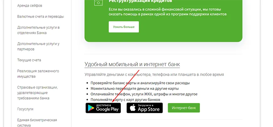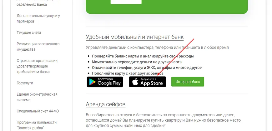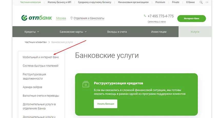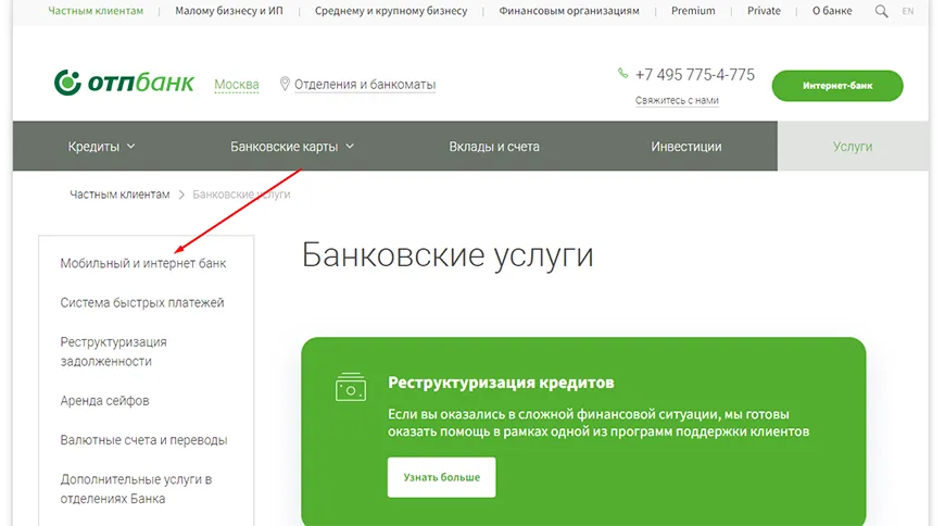 1. Откройте портал кредитного учреждения и на странице «Банковские услуги» выберите «Мобильный и интернет-банк»;