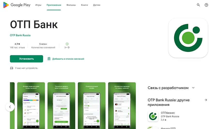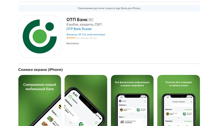 Пока крупнейшие финансовые организации России находятся под секторальными западными санкциями, ОТП Банк, принадлежащий венгерской компании OTP Group, не испытывает давления – учреждение продолжает работу в штатном режиме, хотя и рассматривает возможность ухода с российского рынка. Чтобы дистанционно управлять финансами, клиенты могут скачать приложение ОТП Банк на смартфон – программа доступна к загрузке в популярных каталогах на Android и iOS без каких-либо ограничений. В Store также осуществляется обновление ранее установленных сервисов, а без скачивания интернет-банк по-прежнему открывается в браузере.