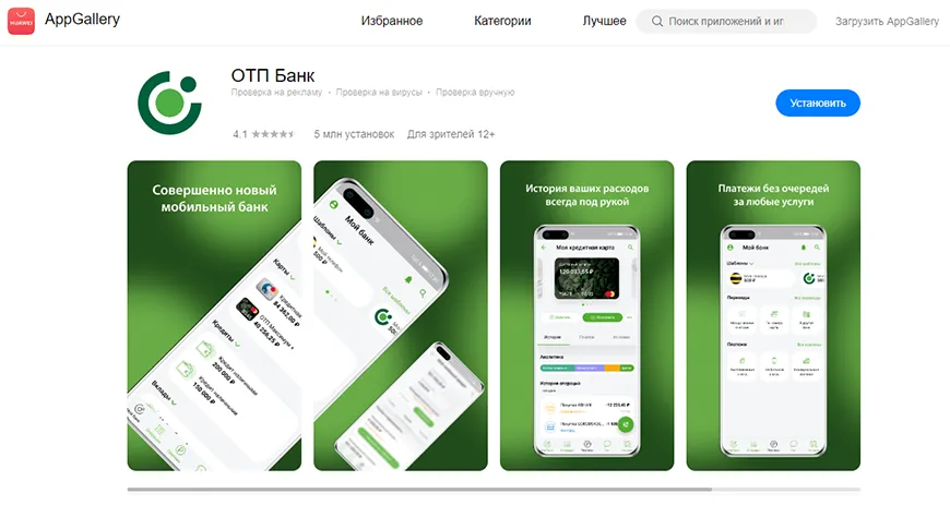 5. На смартфонах без сервисов Google, включая Huawei и Honor, откройте магазин AppGallery, найдите «ОТП Банк», нажмите «Установить».