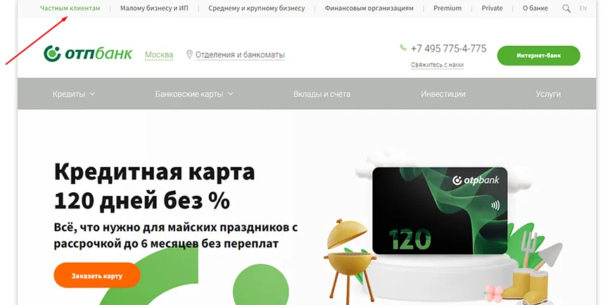 1. Зайдите на главную страницу сайта банка (вкладка «Частным клиентам») – авторизация не требуется;