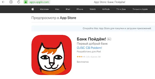 Клиенты банка Пойдем! установить приложение на iOS могут только в Apple Store – других каналов для загрузки продукта нет. В каталоге скачивание производится в фоновом режиме (распаковка полученного файла не требуется), иконка программы сразу появляется на экране устройства.