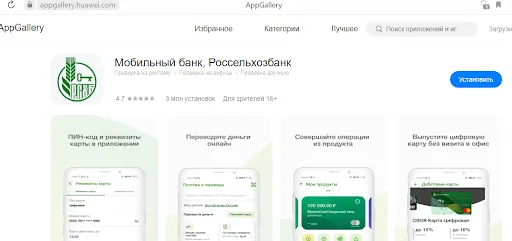 5. Для установки на Huawei, Honor и другие устройства без сервисов Google нажмите кнопку «Загрузите в AppGallery», кликните «Установить». Также доступен поиск по наименованию («Мобильный банк, Россельхозбанк») непосредственно в магазине;