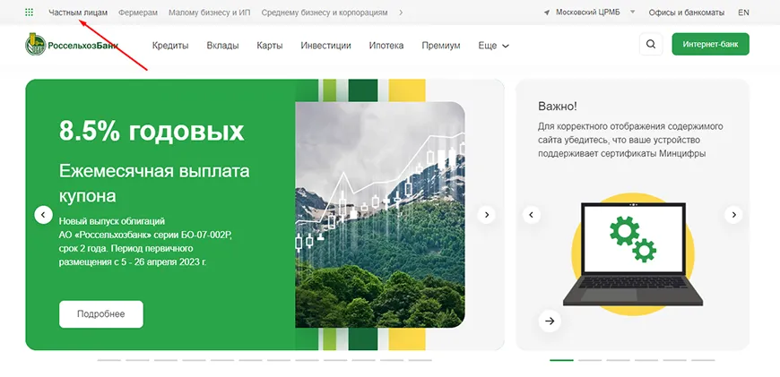1. Откройте сайт РСХБ, сверху нажмите «Частным лицам» (кликнуть необходимо даже в том случае, если по умолчанию уже открыта версия ресурса для физических лиц);