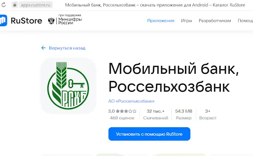6. Чтобы установить в RuStore, откройте сервис, найдите продукт от РСХБ («Мобильный банк, Россельхозбанк»), нажмите «Установить с помощью RuStore».