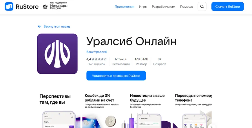 1. Найдите программу в RuStore (через поиск или перейдя по ссылке на сайте финансового учреждения) и нажмите кнопку «Установить с помощью RuStore»;