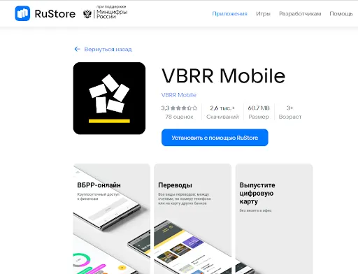 Бесплатно скачать мобильное приложение ВБРР для андроид можно в каталогах Google Play и RuStore. Для начала в поисковой строке необходимо указать название программы – VBRR Mobile.