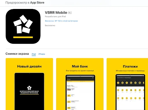 На официальном сайте Всероссийского Банка Развития Регионов написано, что сервис разработан исключительно для гаджетов на основе андроид. Тем не менее, в AppStore приложение VBRR Mobile тоже доступно для скачивания: