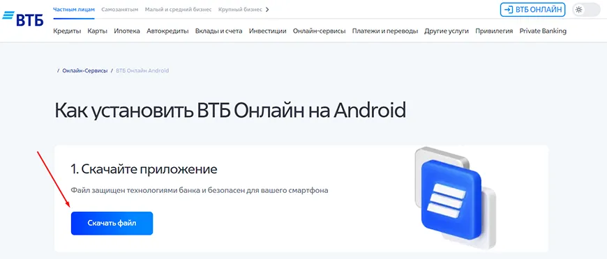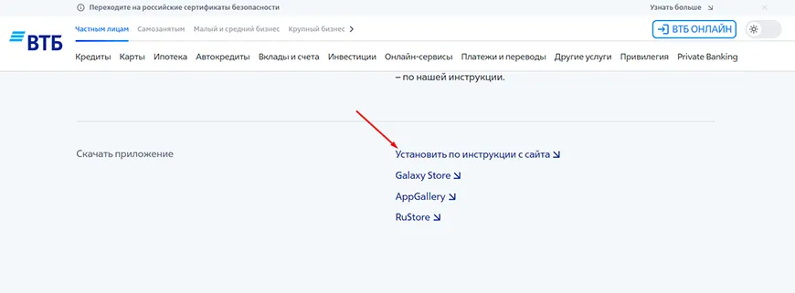 До попадания банка под западные ограничения установить приложение ВТБ Онлайн удавалось в App Store и Google Play (в зависимости от ОС устройства). Теперь продукт удален из данных магазинов и недоступен к скачиванию. Однако для смартфонов на базе Android установка по-прежнему доступна, но через альтернативные Store либо напрямую с сайта кредитного учреждения. Официальное приложение ВТБ на айфон скачать больше нельзя – клиенты могут пользоваться лишь веб-версией кабинета, настроив ускоренный доступ (столь же удобное управление, как в программе).