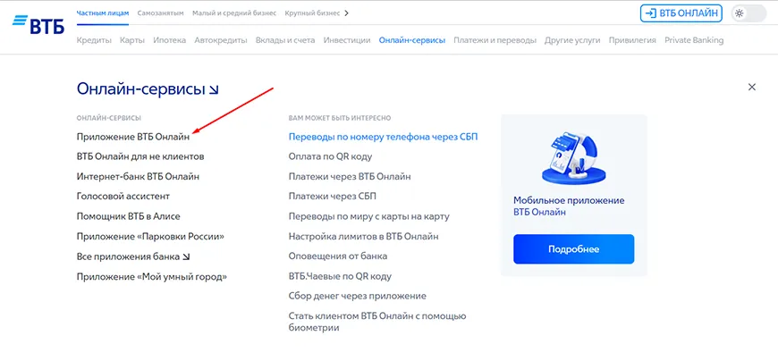 1. Зайдите на сайт банка в раздел для физических лиц, нажмите «Онлайн-сервисы»;