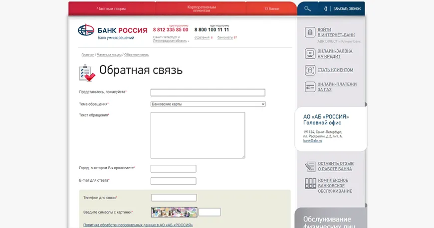 Если у клиента есть вопросы по оформлению и пользованию продуктами и услугами Банка Россия, он может заполнить форму обратной связи для получения ответа – https://abr.ru/face/feedback/. Потребуется указать ФИО, категорию вопроса, к примеру, банковские карты, телефон для обратной связи, электронную почту, а также написать свой вопрос. Банк ответит на запрос в течение 1 рабочего дня.