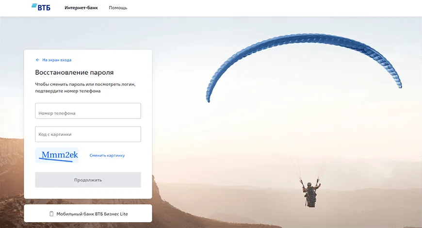 После загрузки новой страницы укажите номер мобильного телефона, использованный при регистрации профиля в отделении финансовой организации. Затем впишите код с картинки и нажмите «Продолжить». Система предложит указать новый пароль от онлайн-банка для ИП и юрлиц два раза и подтвердить операцию.