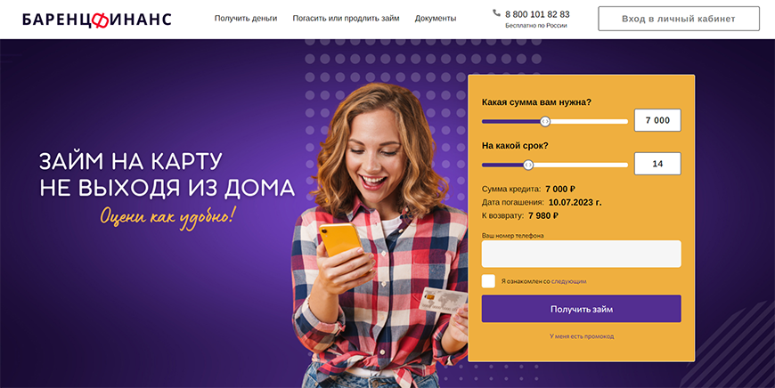 Телефон оператора Баренц Финанс - 8(800) 101-82-83. Звонок бесплатный.