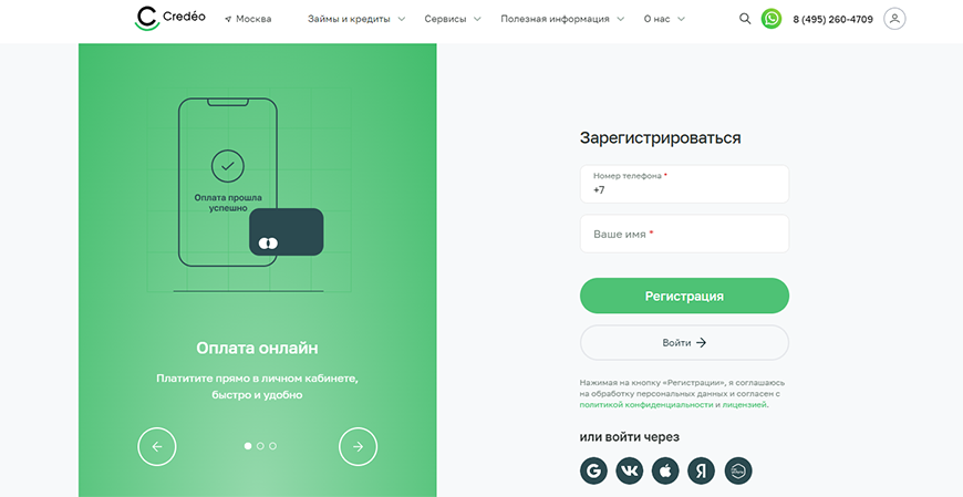 Здесь можно посмотреть как зарегистрироваться и войти в личный кабинет Credeo для получения займов, как оплатить или продлить займ.