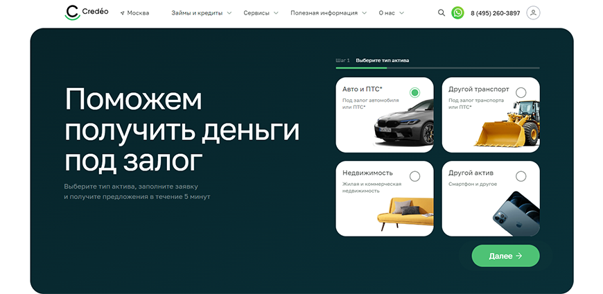 Credeo – организация, помогающая взять микрозаймы жителям разных городов России. Предлагает займы под залог авто, ПТС, недвижимость. Супермаркет залоговых продуктов делает доступнее услуги компаний, которые выдают не только займы, но и кредиты. Работает с банками, МФО, брокерами, автоломбардами. Клиенты могут оценить автомобили, получить страховой полис. Для получения полного доступа к услугам желательно пройти регистрацию в личный кабинет Credeo.
