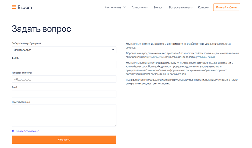 На официальном сайте в разделе «Контакты» работает форма заказа обратного звонка – https://www.ezaem.ru/kontakty/. Для получения помощи нужно воспользоваться кнопкой «Отправить сообщение», указать тип вопроса, ФИО, телефон, e-mail и текст обращения, дополнительно можно прикрепить документ.