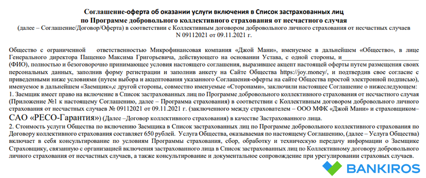 4. Стоимость рассчитывается индивидуально. Размер страховой выплаты и стоимость индивидуального полиса определяются по сумме займа и после оценки анкеты клиента с учетом тарифов компании. Стоимость включения клиента Джой Мани в договор коллективного страхования «РЕСО-Гарантия» составляет 650 рублей.