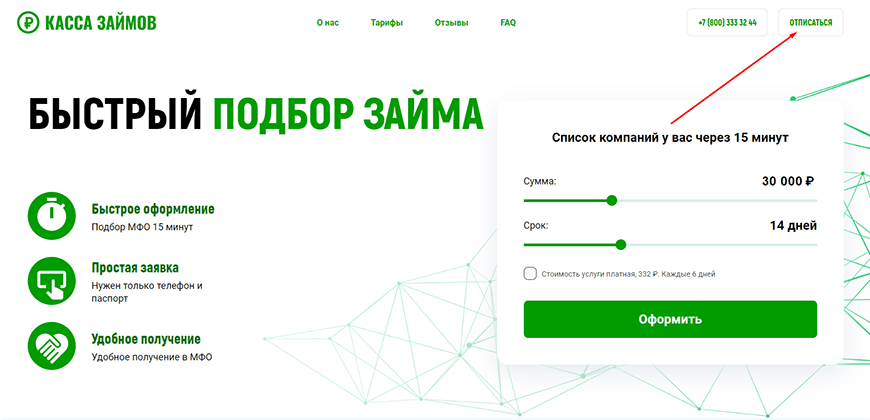 Подать запрос на услуги по подбору предложений через Касса займов можно после оформления платной подписки. Подписка активируется сроком на 30 дней и предполагает списание средств за пользование каждые 6 дней, то есть всего 5 списаний. Отписаться от платных услуг компании можно на сайте Русзайм Развитие.