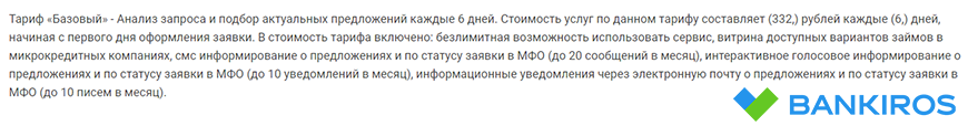 Посредник предоставляет информационные услуги в области микрокредитования. Единственным платным сервисом выступает подписка, которая характеризуется: