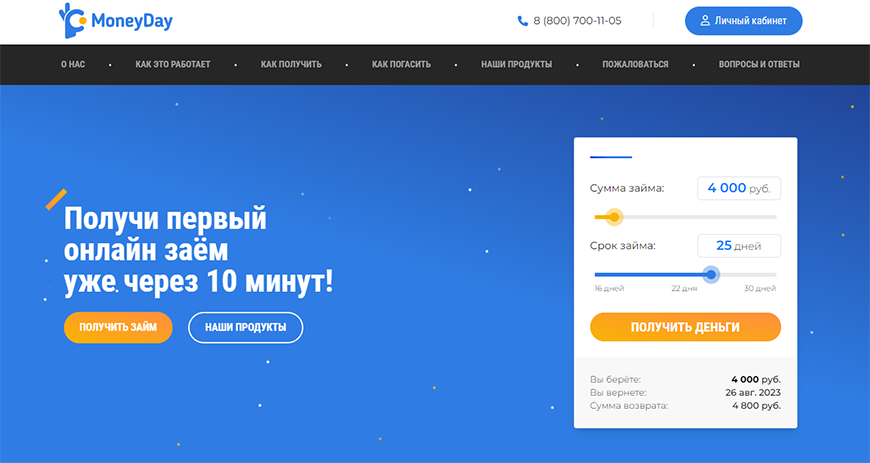 Здесь можно посмотреть как зарегистрироваться и войти в личный кабинет MoneyDay для получения займов, как оплатить или продлить займ.