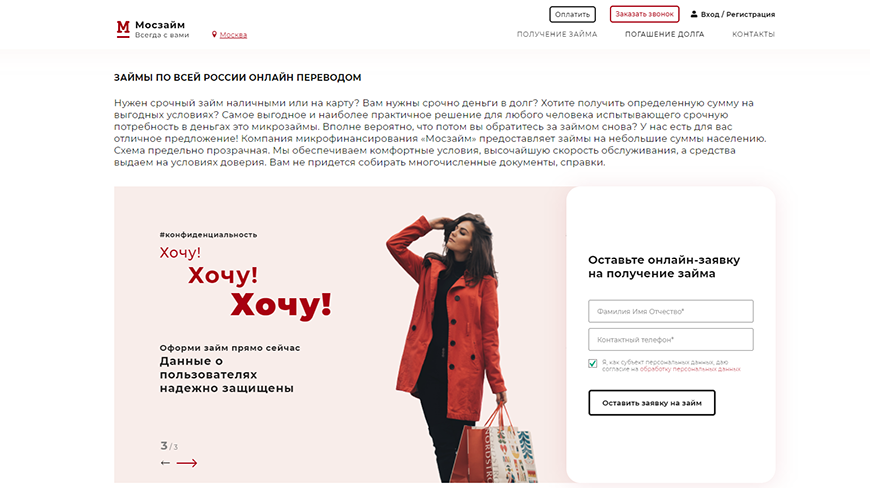 Мосзайм специализируется на предоставлении микрозаймов онлайн на небольшие суммы на короткий срок. Процесс получения денег прост и без лишней бумажной волокиты. Для подачи заявки требуется минимальный пакет документов. Компания предлагает быстрое решение по заявке и перечисление денежных средств на указанный банковский счет заемщика или банковскую карту. При возникновении вопросов используйте телефон для связи.