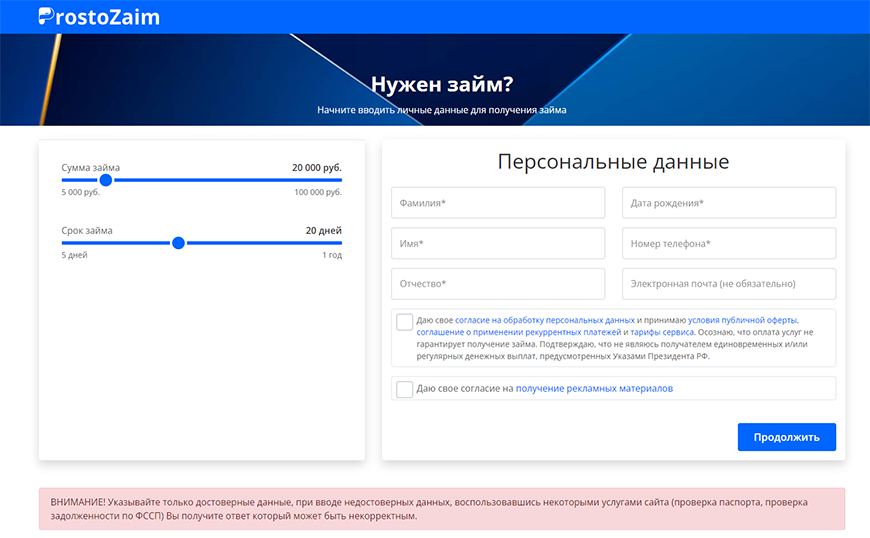 Пройти регистрацию в ProstoZaim не предполагает серьезных усилий – нужно оформить заявку. Выберите сумму и срок займа, введите в активные поля свои персональные данные, дату рождения и электронную почту. Нажмите на «Продолжить», заполните остальные поля. Указывайте достоверные данные, поскольку после проверки информации принимается решение о дальнейшем взаимодействии. Вам нужно будет дать согласие на обработку данных, подписать договор публичной оферты.