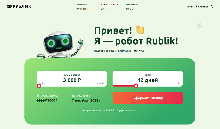 Компания предлагает всего один вариант сервиса. Стоимость последнего составляет 1995 рублей. Списание будет происходить один раз в месяц, вплоть до момента, когда клиент решит отписаться от платных услуг по займам в Рублик.