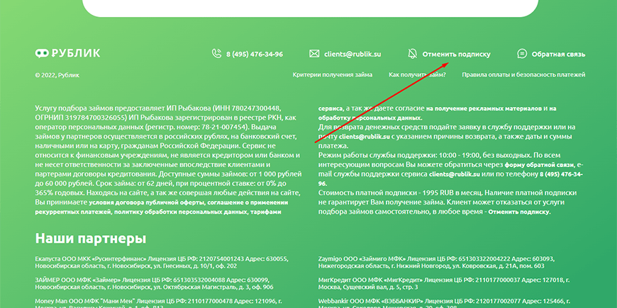 Рублик – информационный посредник между клиентом и МФО. Компания не предлагает услуги кредитования, но оказывает содействие при заключении договора. Согласие на рассылку не дает потенциальному заемщику никаких гарантий и защиты. В статье приведены сведения о том, как отписаться от платных услуг Рублик.