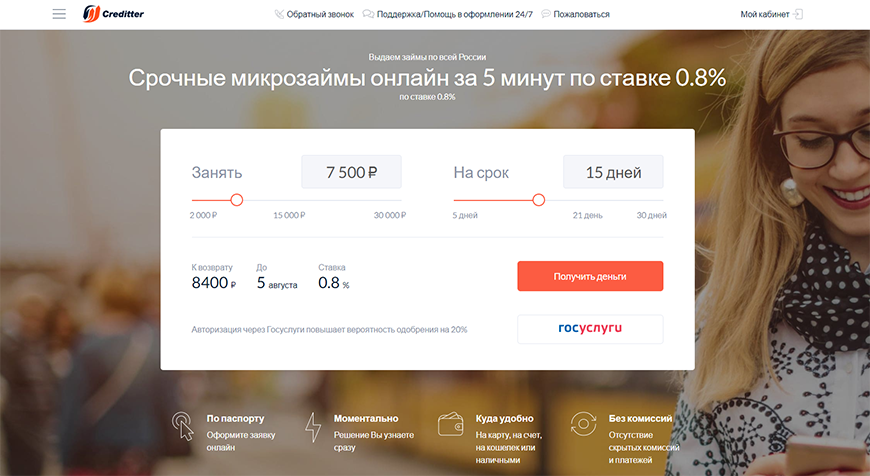Creditter – микрофинансовая компания, предлагающая получить займ на карту срочно. Решение клиенты узнают сразу. Для оформления договора потребуется только паспорт. Средства будут переведены на карту, счет, кошелек или наличными. Обеспечивается индивидуальный подход к каждому клиенту. Есть предложения для лиц с плохой кредитной историей. Компания работает с клиентами, проживающими по всей России в круглосуточном режиме.