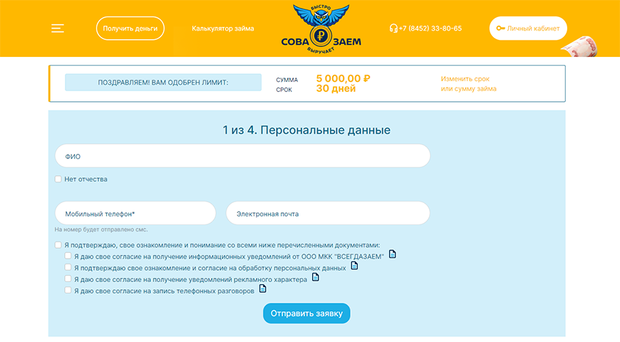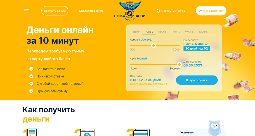 СоваЗаем – микрофинансовая организация, в которой можно получить микрозайм онлайн на нужную сумму за 10 минут на карточку любого банка без личной встречи с менеджером. Услуги доступны лицам с негативной кредитной историей. Есть несколько тарифов, потенциальные клиенты могут использовать онлайн-калькулятор, чтобы выбрать наиболее подходящий вариант для себя. Воспользоваться услугой можно из любого города. В дальнейшем для погашения и отслеживания текущего займа, совершения рекуррентных платежей можно использовать личный кабинет.