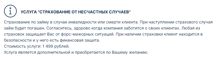 3. Страхование. При наступлении страхового риска страховая компания полностью погашает займ за клиента. Стоимость страхования от несчастных случаев – 1499 рублей, недвижимости — 1899 рублей, банковских карт – 1399 рублей.
