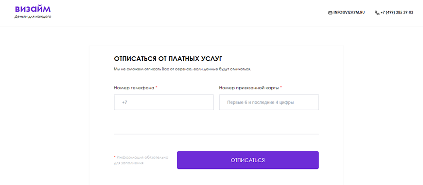 Для авторизации в персональном аккаунте можно зайти на официальный сайт организации. Затем прокрутить страницу в самый низ и кликнуть по кнопке «Отписаться». Откроется форма для ввода мобильного номера и данных карты, с которой списываются средства. Также для удобства можно воспользоваться прямой ссылкой на аккаунт VIZAYM - онлайн микрозаймы на карту.
