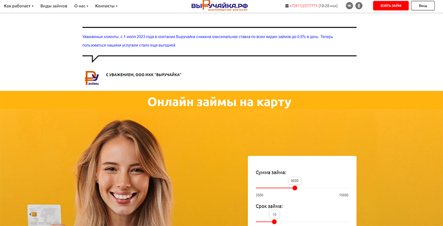 Выручайка - финансовая организация, предоставляющая микрозаемы онлайн на короткий срок. Основной целевой аудиторией являются физические лица, которым требуется небольшая сумма денег для решения финансовых проблем в срочном порядке. Особенность - относительно быстрое рассмотрение заявок, выдача займа в течение нескольких часов. Для получения денег необходимо предоставить минимальный пакет документов и иметь положительную кредитную историю. Используйте телефон по поводу задолженности или уточнения информации.