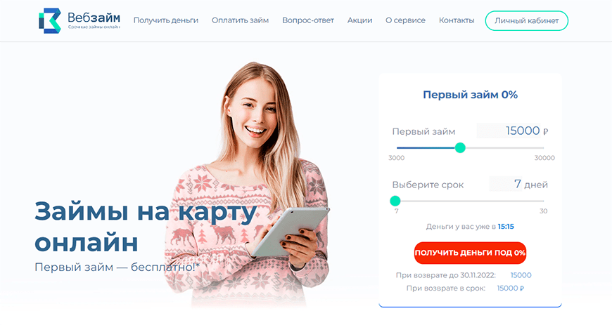 Компания Веб-займ специализируется на выдаче микрозаймов онлайн физическим лицам. Взаимодействие с клиентами предусматривается только в дистанционном режиме: МФО не контактирует с заемщиками напрямую. Среднее время рассмотрения заявки - 5-7 минут.