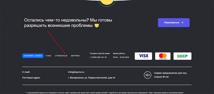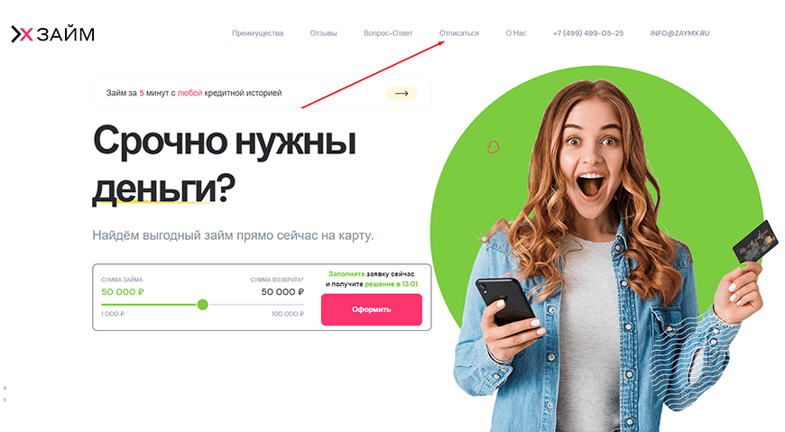 Чтобы отписаться от платных подписок Займ Икс, следует зайти на официальный сайт посредника. Отключить услугу можно по телефону +7(499) 499-05-25 или отправив запрос на info@zaymx.ru. Вы можете запросить возврат через электронную заявку, но сервис имеет право отказать в переводе.