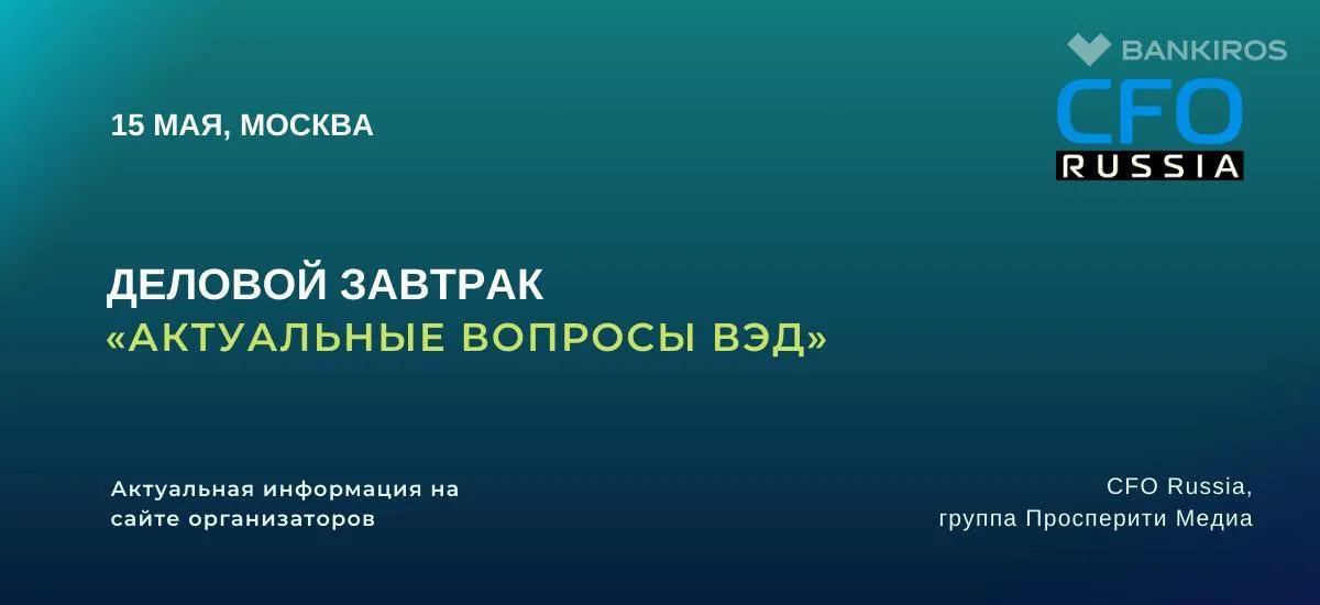15 мая, в Москве состоится Деловой завтрак «Актуальные вопросы ВЭД», организованный группой «Просперити Медиа» и порталом CFO-Russia.ru.