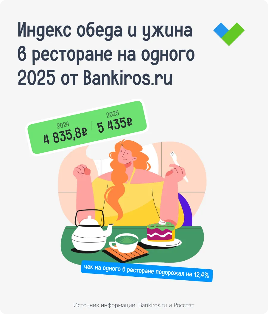 Чек на одного в ресторане подорожал на 12,4% за год.Цена за обед и ужин на одного человека в ресторане в 2024 и 2025 году