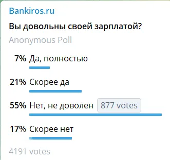 Отметим, что ранее Bankiros.ru проводил опрос на тему удовлетворенности россиян своей заработной платой. Опрос также проходил в телеграм-канал Bankiros.ru.