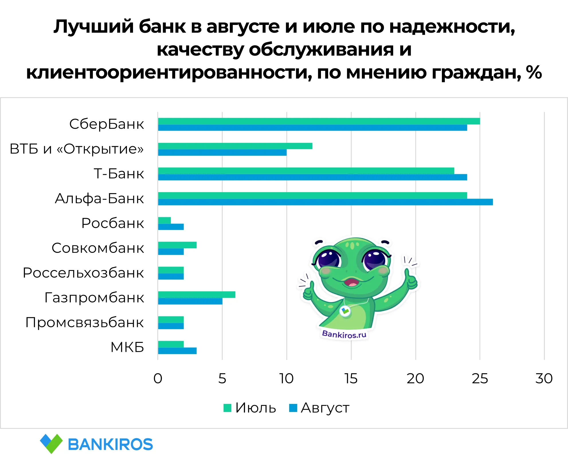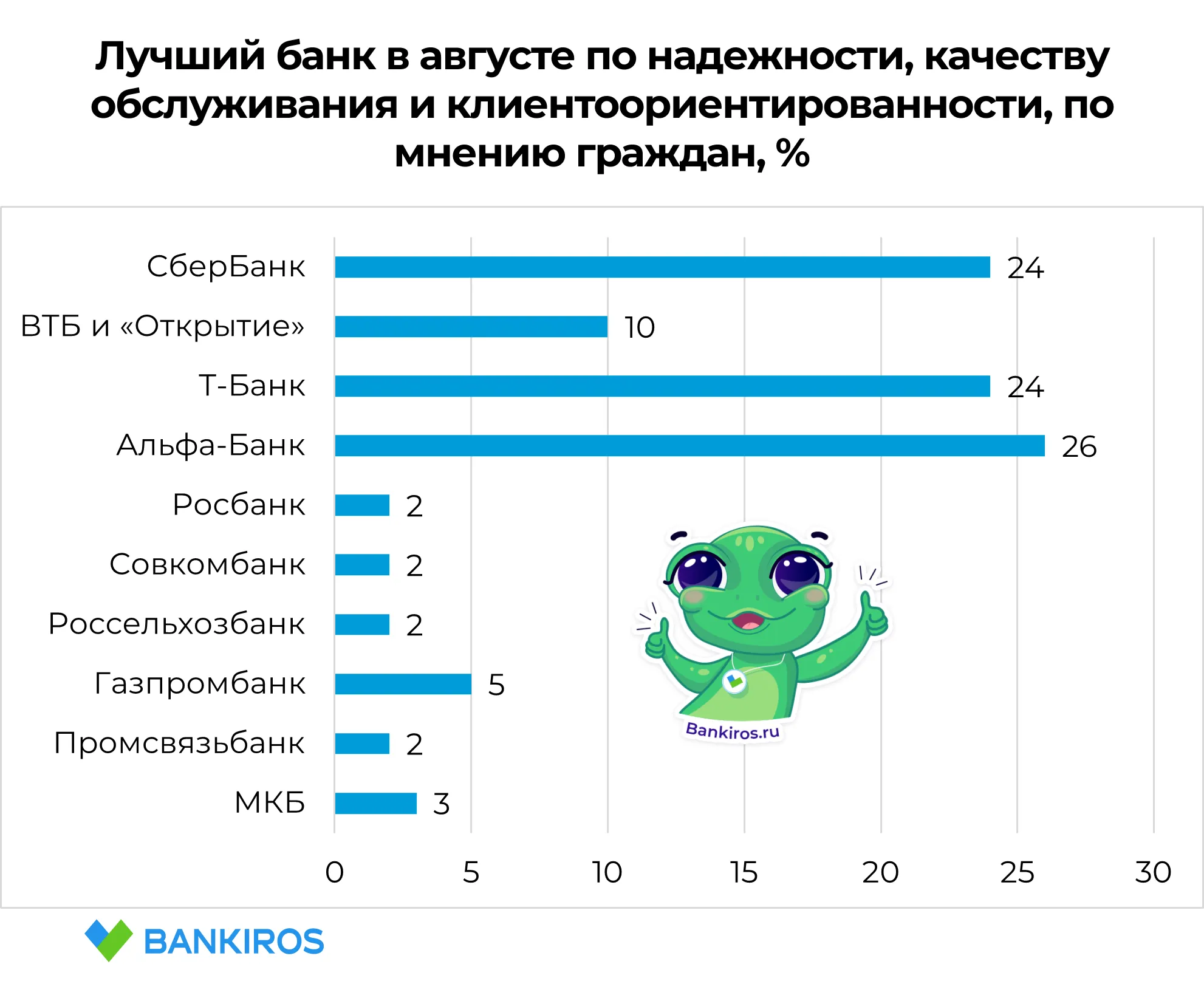 Альфа-Банк стал лучшим банком в августе. Сбер и Т-Банк традиционно вошли в тройку лидеров среди системно значимых кредитных организаций по надежности, качеству обслуживания и клиентоориентированности, говорится в исследовании Bankiros.ru.