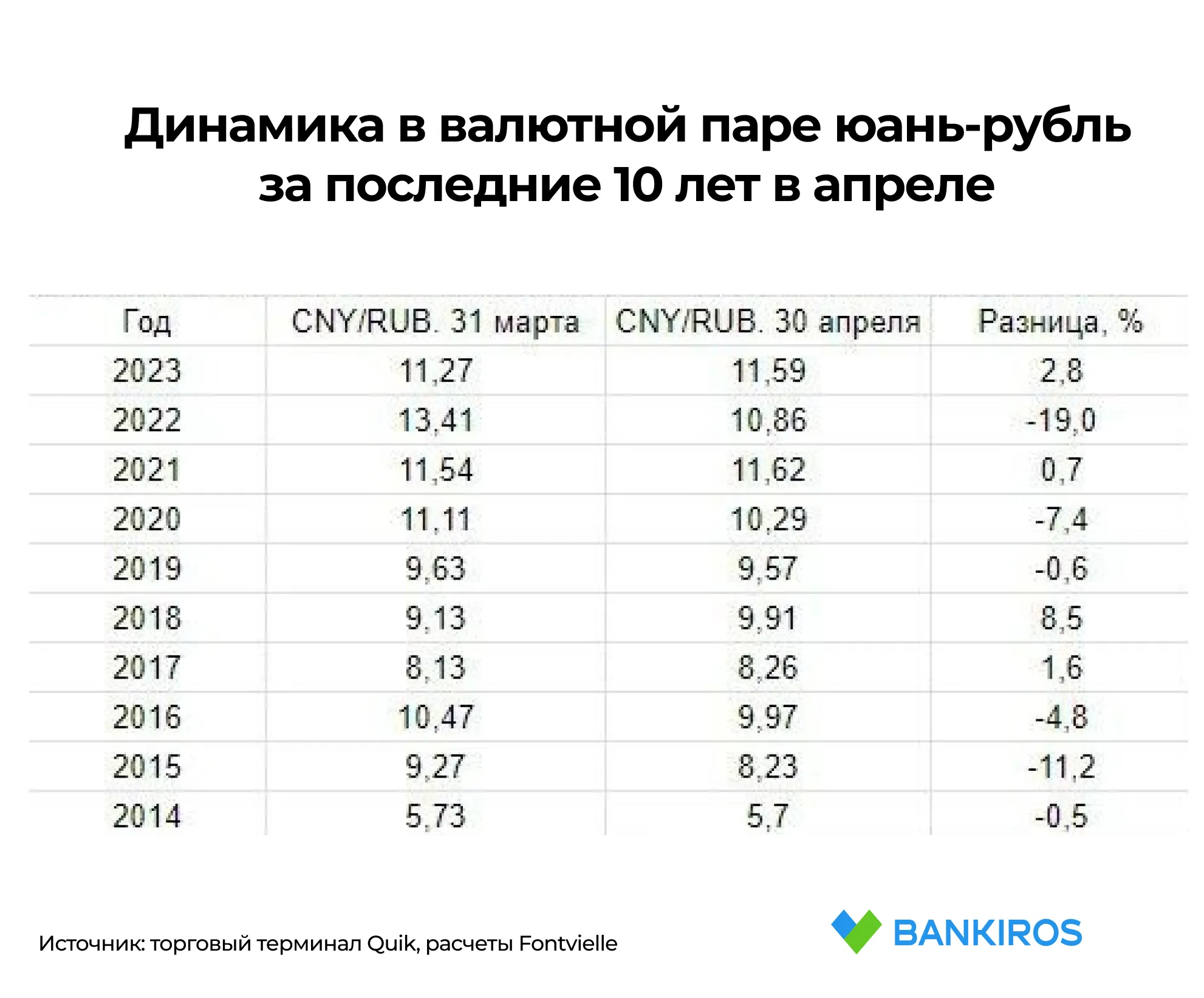 Апрель является нейтральным месяцем для рубля, в котором не наблюдается серьезных колебаний курса. Такие выводы можно сделать на основе динамики курса в предыдущие годы. А как поведет себя нацвалюта по отношению к доллару, евро и юаню в апреле текущего года? Об этом Bankiros.ru спросил руководителя аналитического управления по глобальным рынкам ИК Fontvielle Артура Мейнхарда.